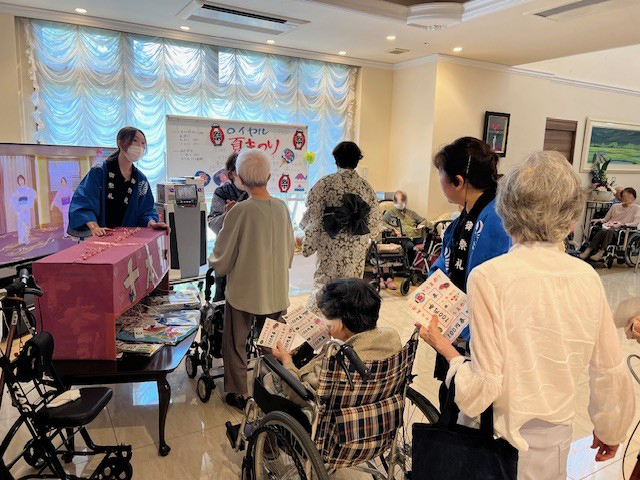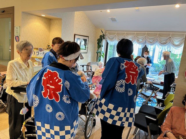 抹茶あずきかき氷・たこ焼き・ミニ大福セット・魚釣りゲーム・千本引きなど、入居者の皆さまに喜んでいただけるように事前準備から当日まで、スタッフみんなで協力して頑張りました(^-^)