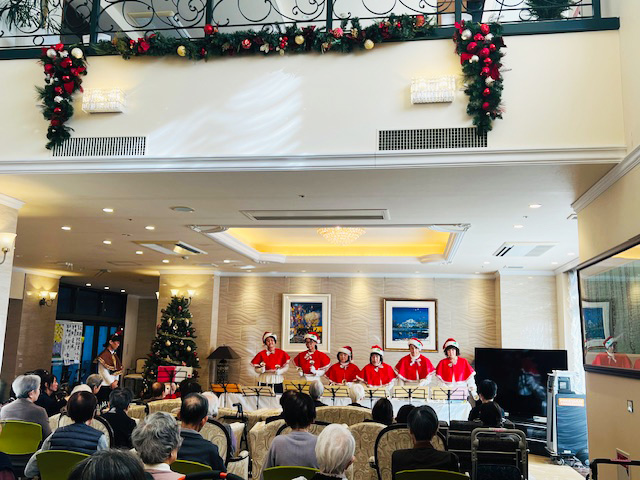 毎年来ていただいているボランティア団体の方々が、クリスマスソングや懐かしの曲を、ハンドベルやオカリナ、鍵盤ハーモニカを使って演奏してくださいます!