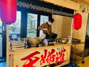 館内に屋台を出して、サクサクの揚げたて天麩羅(身はプリプリ、衣はサクサクの大海老、肉厚なキス、サクッと甘い人参のかき揚げ)をご提供しました! 皆さまが大好きな新鮮なネタの握り寿司と共に、大変喜んでいただけました!(^^)!